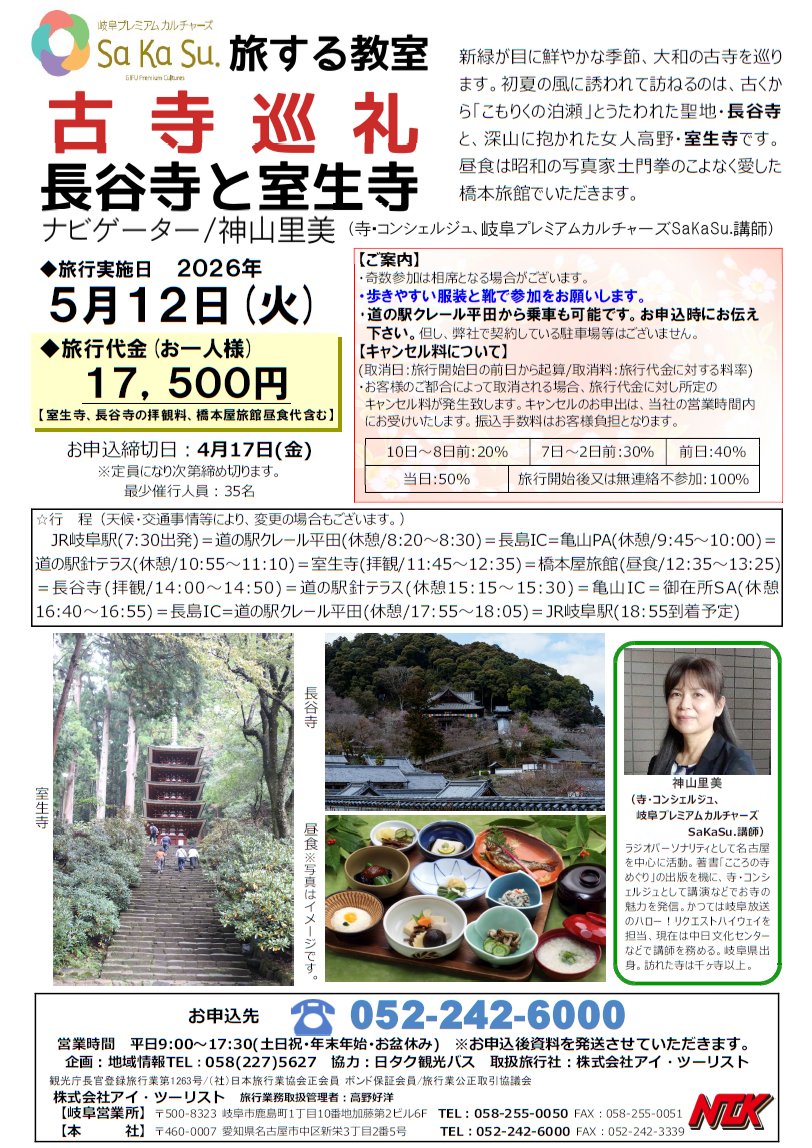 【岐阜駅発着】旅する教室 古寺巡礼 長谷寺と室生寺 お問い合わせ・お申込みは 052-242-6000 まで! (平日:9:00~17:30※土日祝・年末年始・お盆休み) 3/2より申込み受付開始!! Tweet
