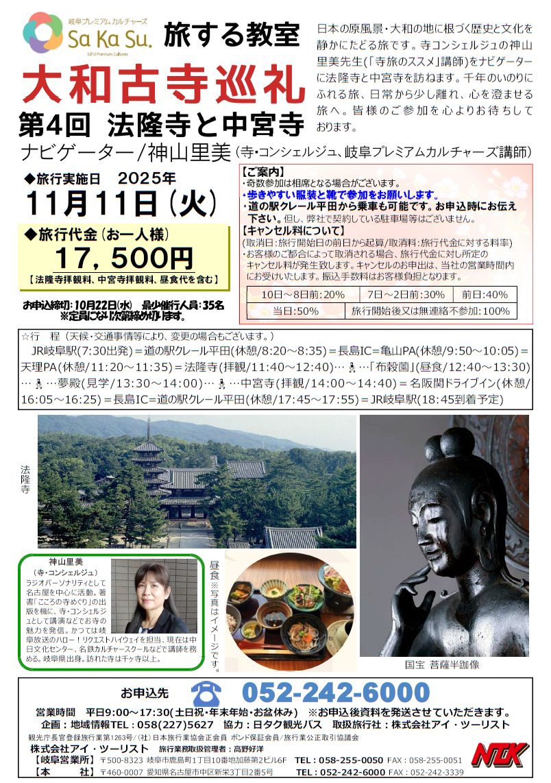 【岐阜駅発着】旅する教室 大和古寺巡礼 第4回 本コースは定員に達したため、お申込みを締め切らせていただきました。 たくさんのお申込みありがとうございました。(10/15現在) 9月30日9:00~申込み受付開始!!※定員になり次第締め切ります。 Tweet