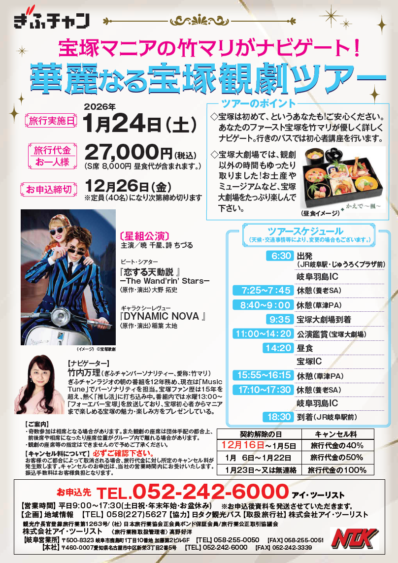 【岐阜駅発着】ぎふチャン 宝塚マニアの竹マリがナビゲート! 華麗なる宝塚観劇ツアー お問い合わせ・お申込みは 052-242-6000 まで! (平日:9:00~17:30※土日祝・年末年始・お盆休み) Tweet